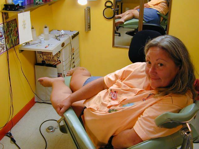 Hi there, thought you might like to see my wife's Peggy, Kokopelli tat, this is on her right lower leg, I now have a matching one on left lower leg - Bear |